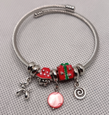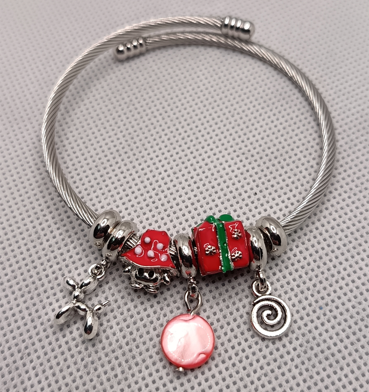 ۳- دستبند پاندورا با مهرههای میناکاری و استیل (شامل جعبه کادو، قارچ، آویز اسپیرال، و سگ بادکنکی) و صدف قرمز