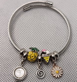 ۳- دستبند پاندورا با مهرههای میناکاری و استیل (شامل بستنی قیفی، آناناس، آویز اسپیرال، و بابونه) و صدف سفید